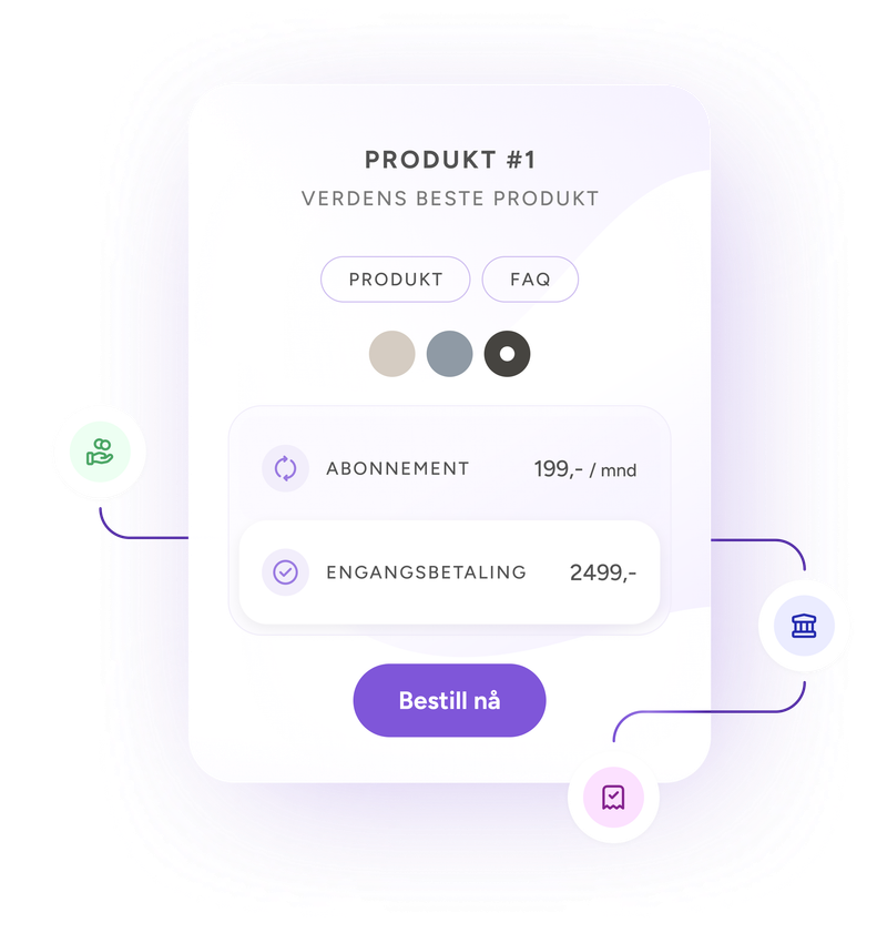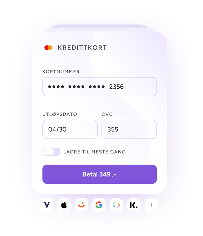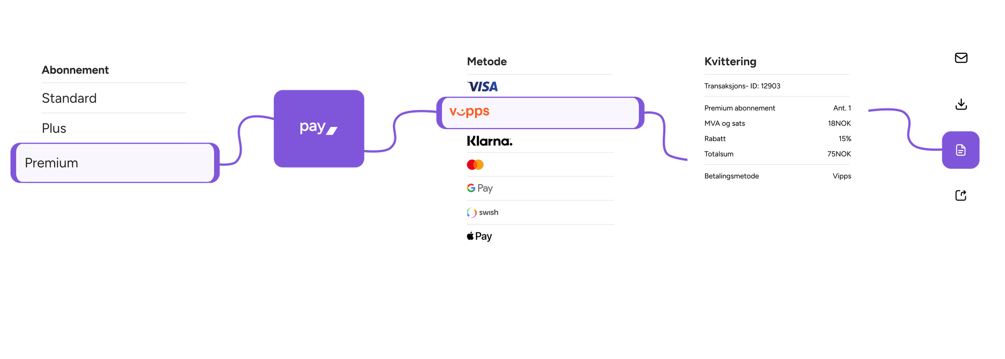 Selg billetter, tjenester og produkter på tvers av kanaler. Koble betaling til brukerens konto slik at tilgang gis automatisk i appen eller på web. Rapportering og eksport gir god kontroll på inntektsstrømmer og churn. Funksjoner for svindelkontroll og refusjoner er innebygd for trygg drift. Flere betalingsmetoder kan aktiveres uten utviklingsløp.