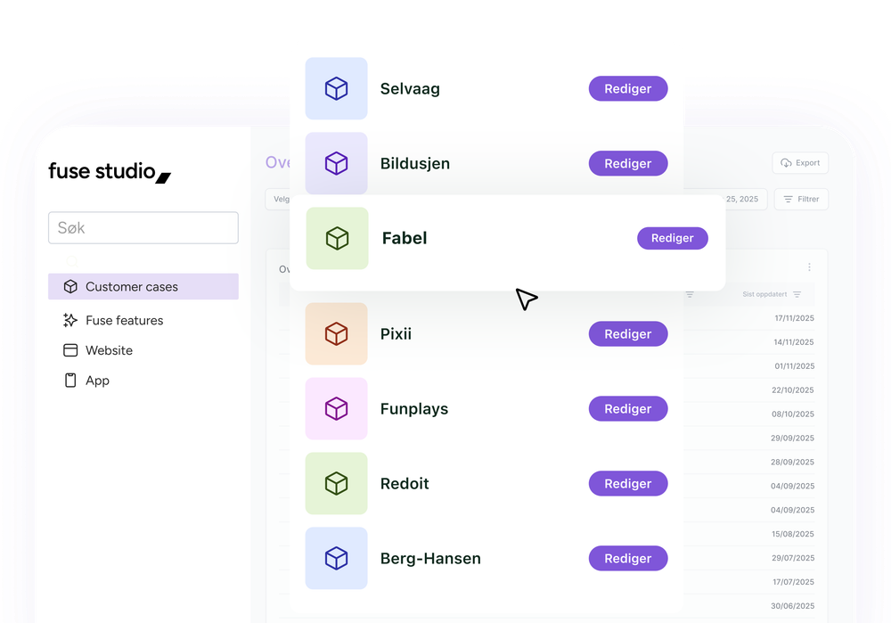Fuse Studio er et omfattende back-office-system som tilpasses deres unike datamodell og forretningsregler. Her håndterer dere alt fra rollestyring til CRM og push-automasjon, og det kan opprettes dashboards til forskjellige formål.