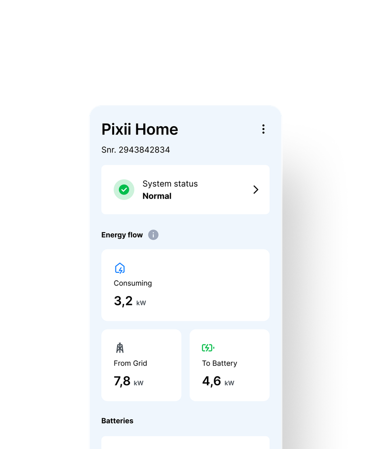 Pixii Home er en energiløsning ment for privat bruk i hus og hytter som reduserer energikostnadene ved å optimere eget bruk, men også støtte inntektsgivende tjenester tilbake mot netteier. Med enkel installasjon og styring i etterkant via app, gir Pixii Home mange fordeler både for de som produserer strøm selv, men også for de som bor i områder med ustabilt strømnett eller kun ønsker å minimere strømkostnadene.
